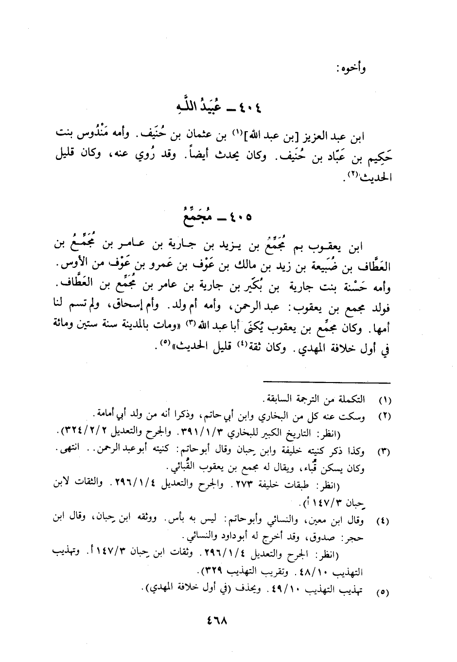 3 وكذا ذكر كنيته خليفة وابن حبان وقال أبو حاتم: كنيته أبو عبد الرحمن.. انتهى. وكان يسكن قباء، ويقال له محمع بن يعقوب القبائي. (انظر: طبقات خليفة 273. والجرح والتعديل 4/1/296. والثقات لابن حبان 3/147أ) .