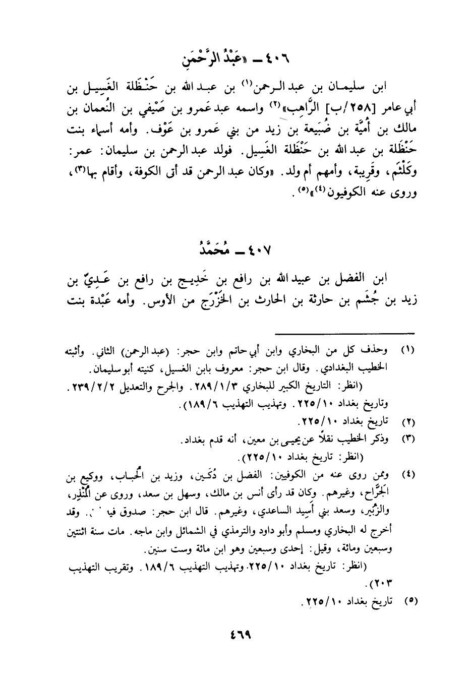 1 وحذف كل من البخاري وابن أبي حاتم وابن حجر: (عبد الرحمن) الثاني. وأثبته الخطيب البغدادي. وقال ابن حجر: "معروف بابن الغسيل، كنيته أبو سليمان". (انظر: التاريخ الكبير للبخاري 3/1/289. والجرح والتعديل 2/2/239. وتاريخ بغداد 10/225. وتهذيب التهذيب 6/189) .
