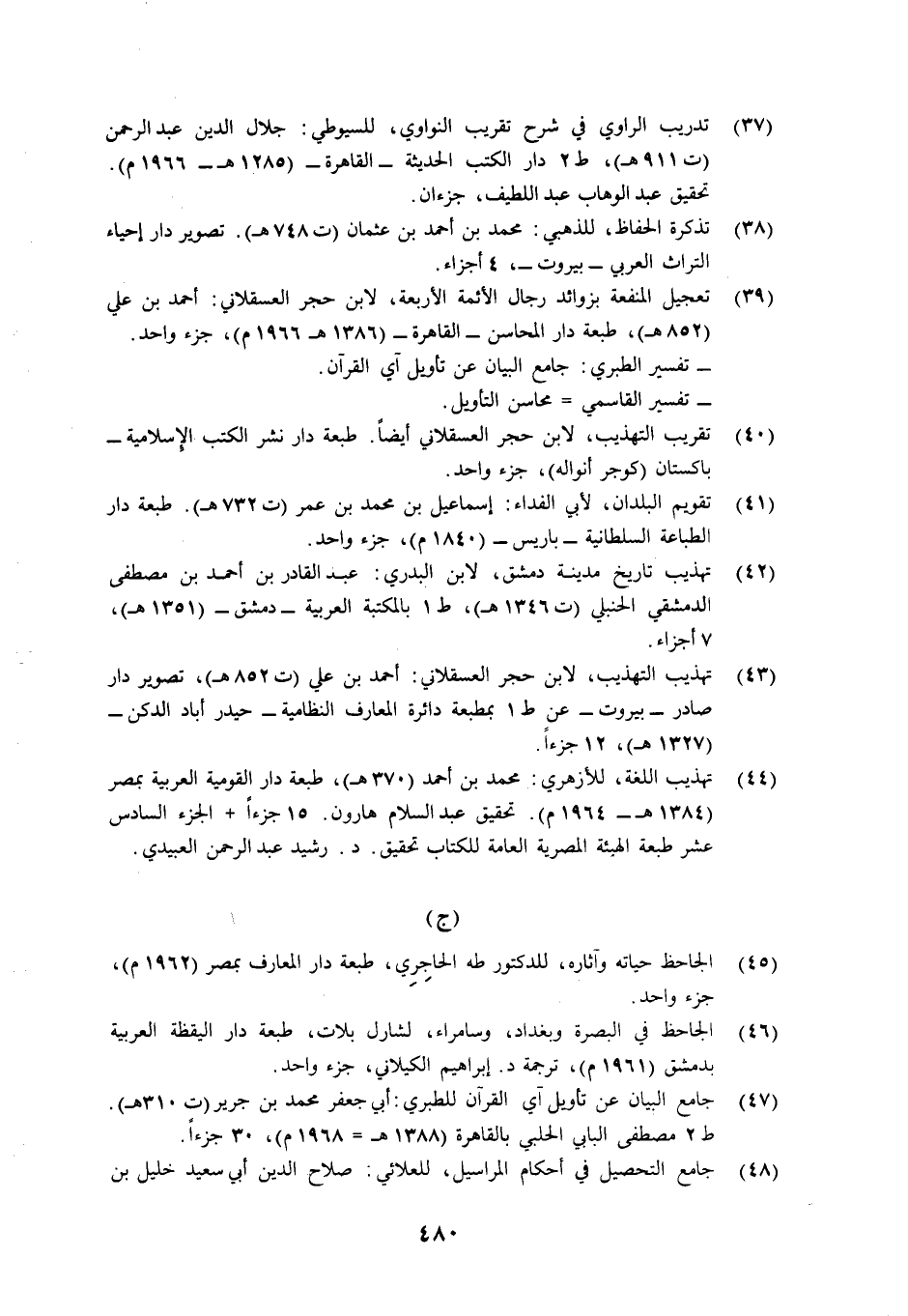 تهذيب التهذيب، لابن حجر العساقلاني: أحمد بن علي (ت 852 هـ) ، تصوير دار صادر- بيروت- عن ط1 أبمطبعة دائرة المعارف النظامية- حيدر أباد الداكن- (1327 هـ) ،12 جزء.