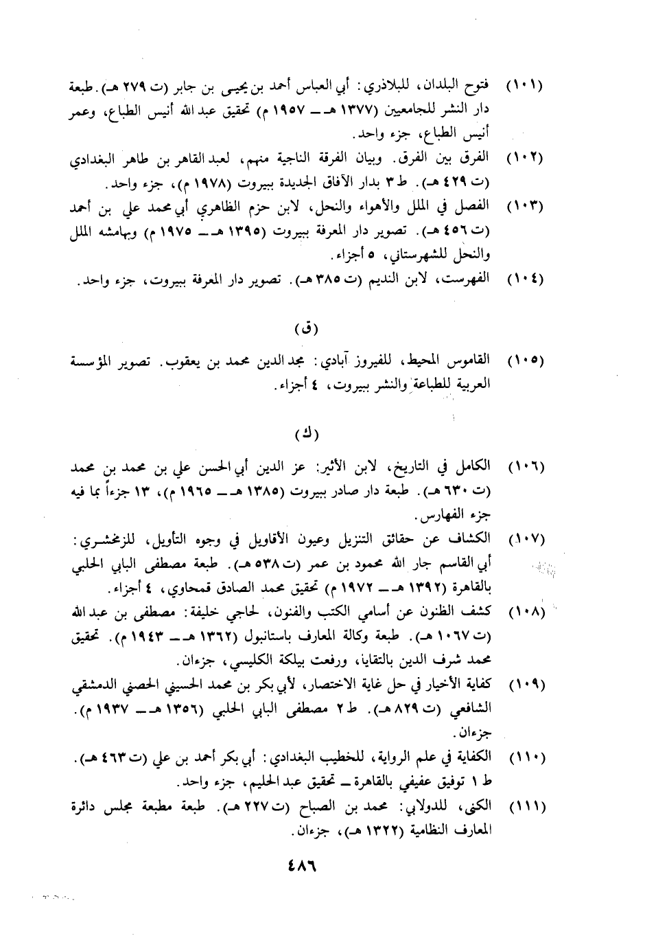 فتوح البلدان، للبلاذري: أبي العباس أحمد بن يحيى بن جابر (ت 279 هـ) . طبعة دار النشر للجامعيين (1377 هـ- 1957 م) تحقيق عبد الله أنيس الطباع، وعمر أنيس الطباع، جزء واحد.
