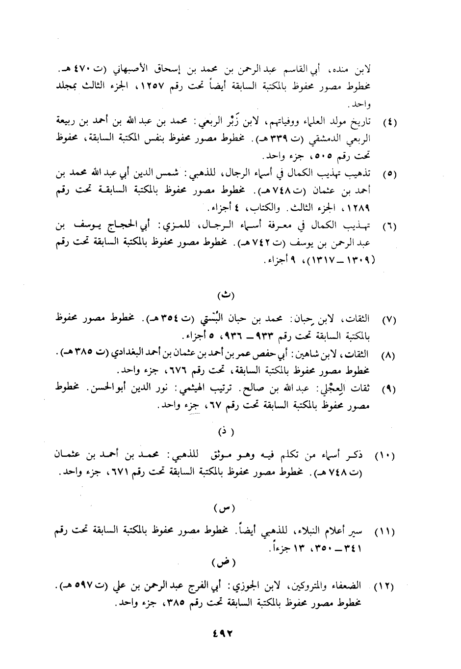 تهذيب الكمال في معرفة أسماء الرجال، للمزي: أبي الحجاج يوسف بن عبد الرحمن بن يوسف (ت 742 هـ) . مخطوط مصور محفوظ بالمكتبة السابقة تحت رقم 1309- 1317) ، 9 أجزاء.