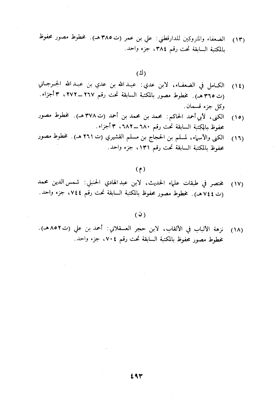 الكامل في الضعفاء، لابن عدي: عبد الله بن عدي بن عبد الله الجرجاني (ت 365 هـ) . مخطوط مصور بالمكتبة السابقة تحت رقم 267-272، 3 أجزاء. وكل جزء قسمان.