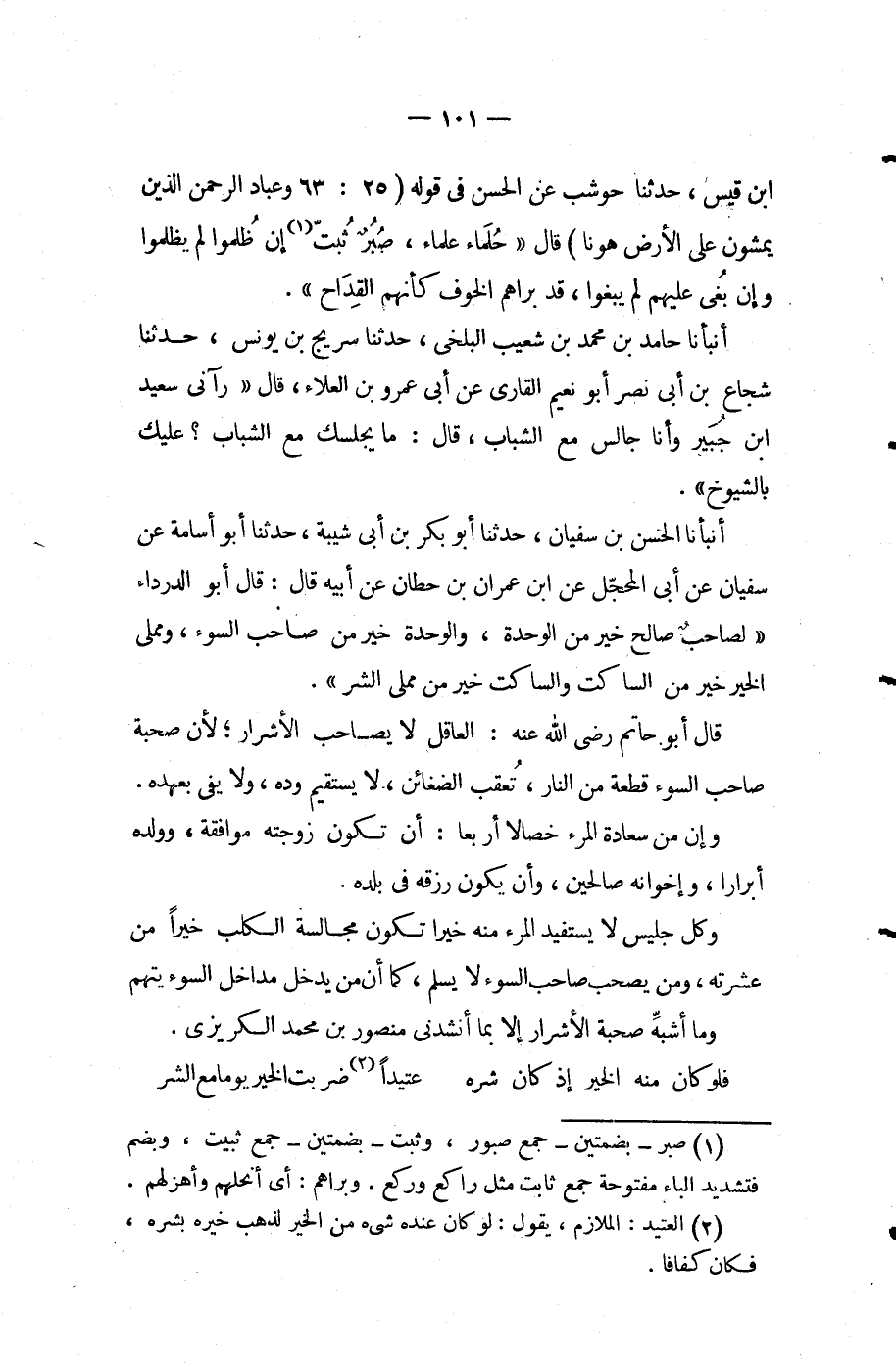 أَنْبَأَنَا الْحَسَنُ بْنُ سُفْيَانَ حَدَّثَنَا أَبُو بَكْرِ بْنُ أَبِي شَيْبَةَ حَدَّثَنَا أَبُو أُسَامَةُ عَنْ سُفْيَانَ عَنْ أَبِي الْمُحَجَّلِ عَنِ ابْنِ عِمْرَانَ بْنِ حِطَّانَ عَنْ أَبِيهِ قَالَ قَالَ أَبُو الدَّرْدَاءِ لصاحب صالح خَيْرٌ مِنَ الْوَحْدَةِ وَالْوَحْدَةُ خَيْرٌ من صاحب السُّوءِ وَمُمْلِي الْخَيْرِ خَيْرٌ مِنَ السَّاكِتِ وَالسَّاكِتُ خَيْرٌ مِنْ مُمْلِي الشَّرِّ