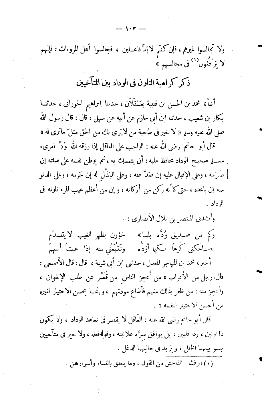 قال أَبُو حاتم رَضِيَ اللَّه عنه الواجب على العاقل إذا رزقه الله ود امريء مسلم صحيح الوداد محافظ عَلَيْهِ أن يتمسك به ثم يوطن نفسه على صلته إن صرمه وعلى الإقبال عَلَيْهِ إن صد عنه وعلى البذل له إن حرمه وعلى الدنو منه إن باعده حتى كأنه ركن من أركانه وإن من أعظم عيب المرء تلونه في الوداد