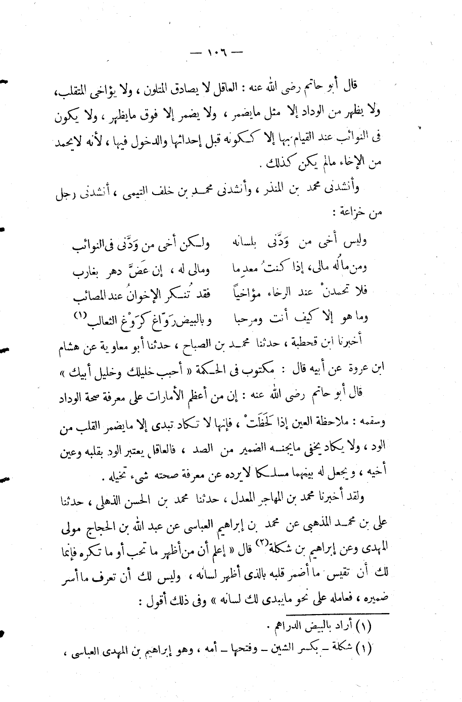 ولقد أَخْبَرَنَا مُحَمَّد بْن المهاجر المعدل حَدَّثَنَا مُحَمَّدُ بْنُ الْحَسَنِ الذُّهْلِيُّ حَدَّثَنَا علي بْن مُحَمَّد المذهبي عَن مُحَمَّد بْن إِبْرَاهِيم العباسي عَن عَبْد اللَّه بْن الحجاج مولى المهدي وعن إِبْرَاهِيم بْن شكلة قَالَ اعلم أن من أظهر مَا تحب أو مَا تكره فإنما لك أن تقيس مَا أضمر قلبه بالذي أظهر لسانه وليس لك أن تعرف مَا أسر ضميره فعامله على نحو مَا يبدي لك لسانه وفي ذلك أقول
