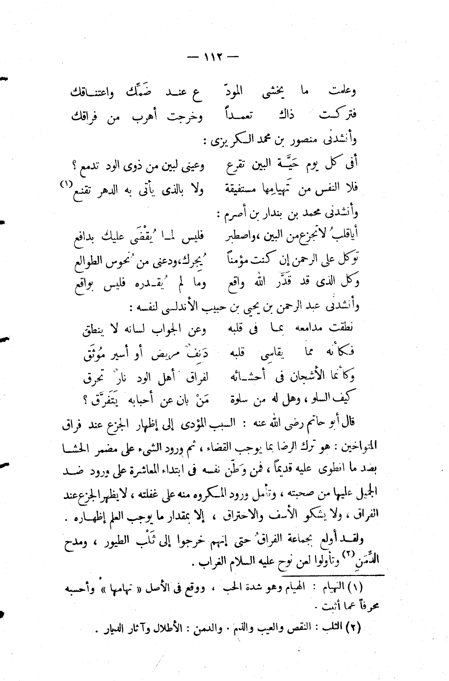 قال أَبُو حاتم رَضِيَ اللَّه عنه السبب المؤدي إلى إظهار الجزع عند فراق المتواخين هو ترك الرضا بما يوجب القضاء ثم ورود الشيء على مضمر الحشا بعدما انطوى عَلَيْهِ قديما فمن وطن نفسه في ابتداء المعاشرة على ورود ضد الجميل عليها من صحبته وتأمل ورود المكروه منه على غفلته لا يظهر الجزع عند الفراق ولا يشكو الأسف والاحتراق إلا بمقدار مَا يوجب العلم إظهاره