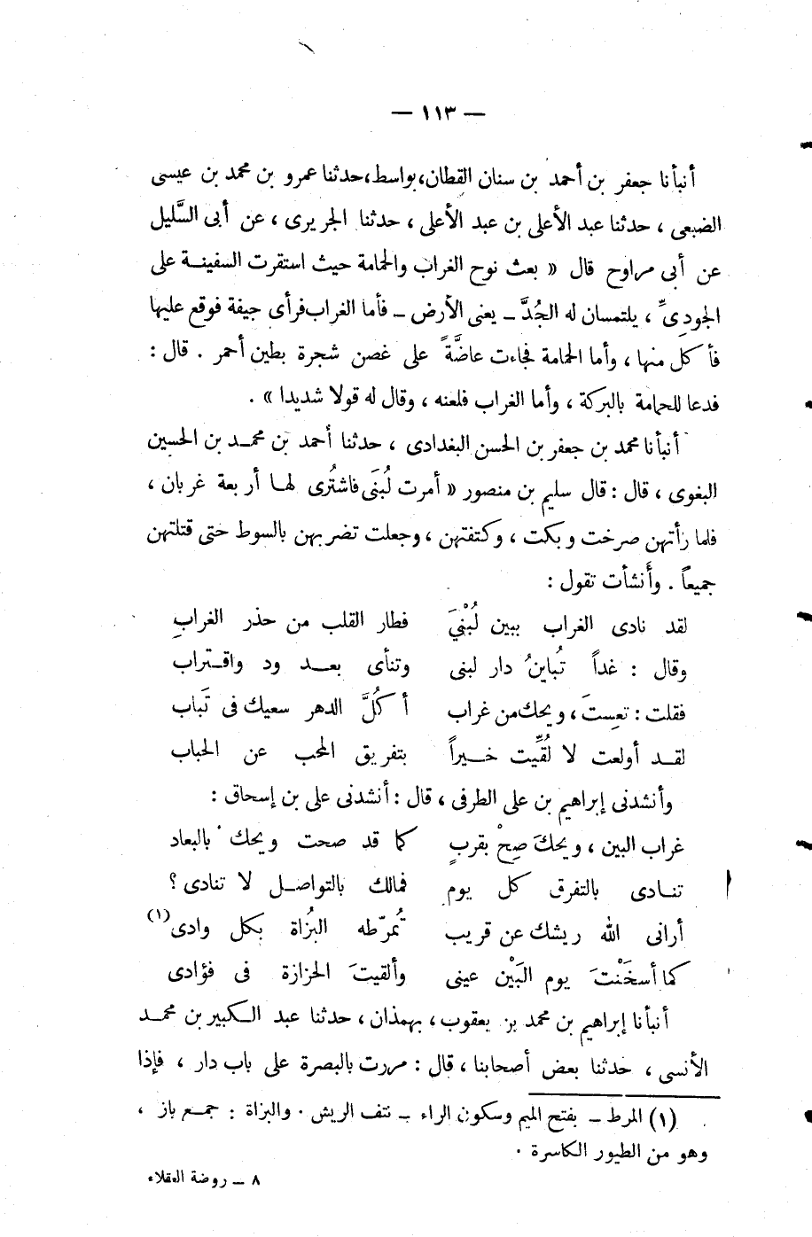أنبأنا جعفر بْن أَحْمَد بْن سنان القطان بواسط حَدَّثَنَا عمرو بْن مُحَمَّد بْن عيسى الضبعي حَدَّثَنَا عَبْدُ الأَعْلَى بْنُ عَبْدِ الأعلى حَدَّثَنَا الجريري عَن أَبِي السليل عن أبي مراوح قَالَ بعث نوح الغراب والحمامة حيث استقرت السفينة على الجودي يلتمسان له الجد يعني الأرض فأما الغراب فرأى جيفة فوقع عليها فأكل منها وأما الحمامة فجاءت عاضة على غصن شجرة بطين أحمر قَالَ فدعا للحمامة بالبركة وأما الغراب فلعنه وقال له قولا شديدا