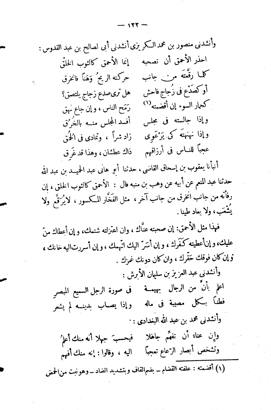 وأنشدني منصور بْن مُحَمَّد الكريزي أنشدني أَبِي لصالح بْن عَبْد القدوس ... احذر الأحمق أن تصحبه ... إنما الأحمق كالثوب الخلق