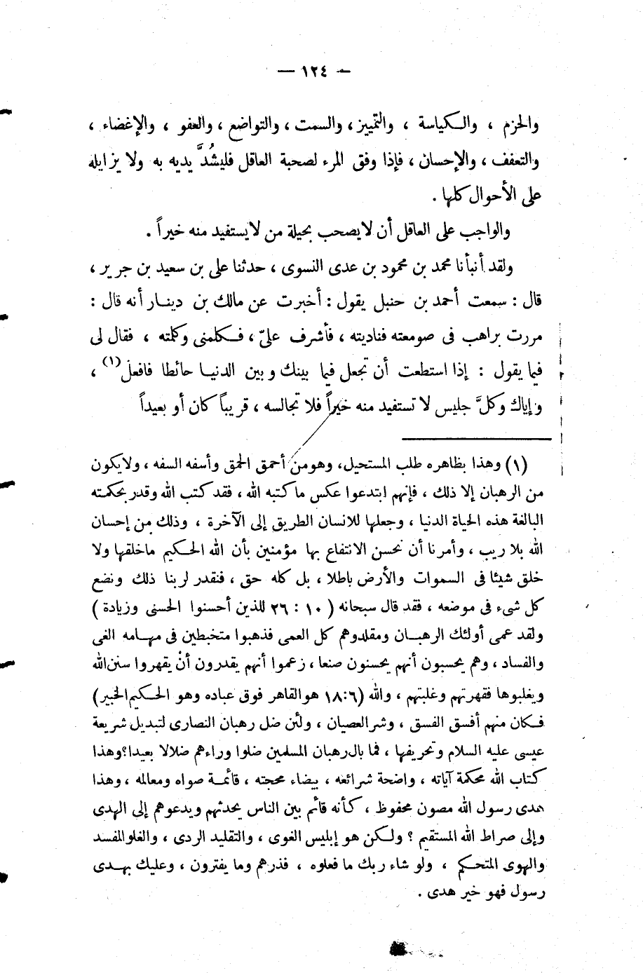 ولقد أَنْبَأَنَا مُحَمَّد بْن محمود بْن عدي النسوي حَدَّثَنَا علي بْن سَعِيد بْن جرير قَالَ سمعت أَحْمَد بْن حنبل يقول أخبرت عَن مالك بْن دينار أنه قَالَ مررت براهب في صومعته فناديته فأشرف علي فكلمني وكلمته فقال لي فيما يقول إذا استطعت أن تجعل فيما بينك وبين الدنيا حائطا فافعل وإياك وكل جليس لا تستفيد منه خيرا فلا تجالسه قريبا كان أو بعيدا