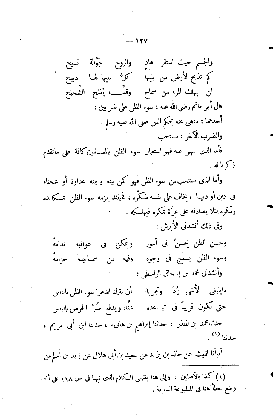 قال أَبُو حاتم رَضِيَ اللَّه عنه سوء الظن على ضربين أحدهما منهي عنه بحكم النَّبِيّ صَلَّى اللَّه عَلَيْهِ وسلم والضرب الآخر مستحب