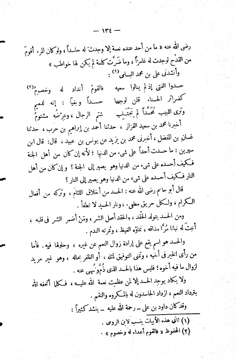 أَخْبَرَنَا مُحَمَّدُ بْنُ سَعِيدٍ الْقَزَّازُ حَدَّثَنَا أَحْمَد بْن إِبْرَاهِيم بْن حرب حَدَّثَنَا غسان بْن المفضل أخبرني مُحَمَّد بْن يزيد عَن يونس بْن عُبَيْد قَالَ قَالَ ابن سيرين مَا حسدت أحدا على شيء من الدنيا لأنه إن كان من أهل الجنة فكيف أحسده على شيء من الدنيا وهو يصير إلى الجنة وإن كان من أهل النار فكيف أحسده على شيء من الدنيا وهو يصير إلى النار عنه الحسد من أخلاق اللئام وتركه من أفعال الكرام ولكل حريق مطفيء ونار الحسد لا تطفأ