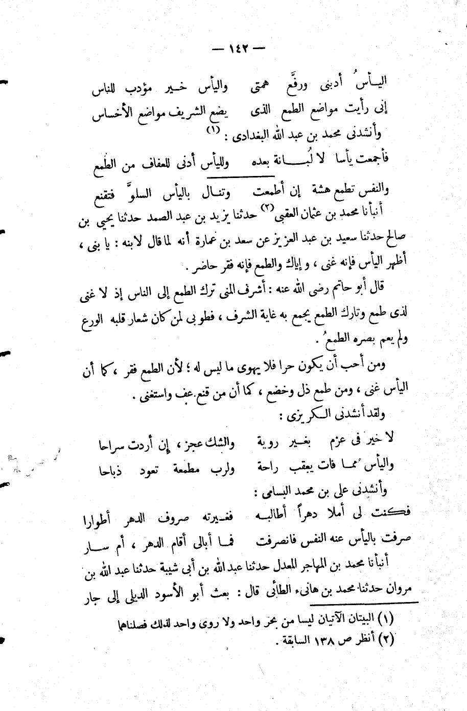 قال أَبُو حاتم رَضِيَ اللَّه عنه أشرف المنى ترك الطمع إلى الناس إذ لا غنى لذي طمع وتارك الطمع يجمع به غاية الشرف فطوبى لمن كان شعار قلبه الورع ولم يعم بصره الطمع