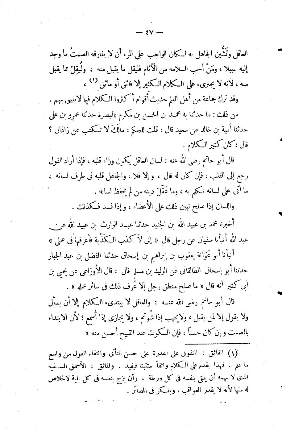 قال أبوحاتم رَضِيَ اللَّه عنه والعاقل لا يبتديء الكلام إلا أن يسأل ولا يقول إلا لمن يقبل ولا يجيب إذا شوتم ولا يجازي إذا أسمع لأن الابتداء بالصمت وإن كان حسنا فإن السكوت عند القبيح أحسن منه