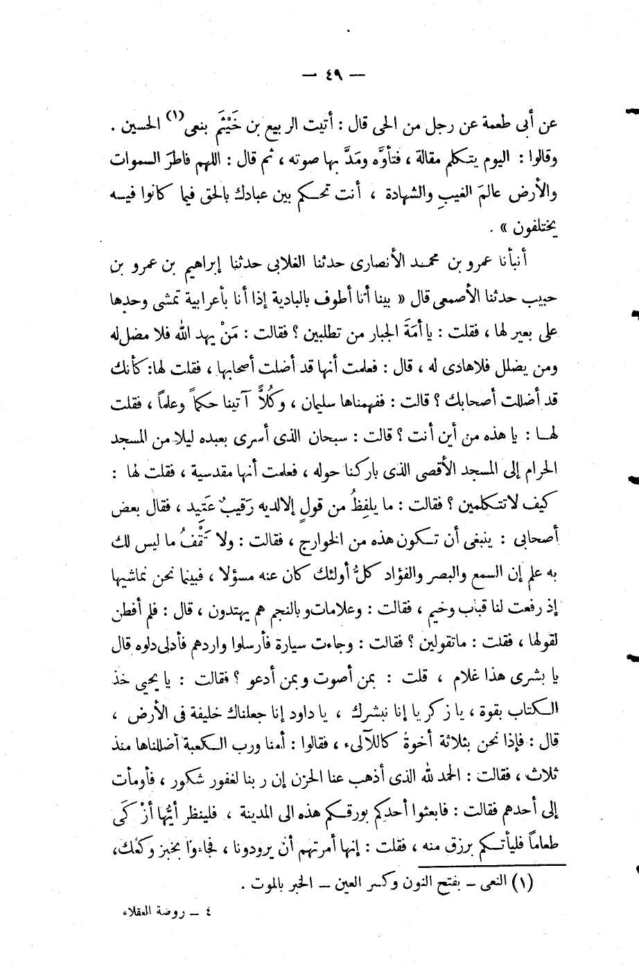 أنبأنا عمرو بْن مُحَمَّد الأنصاري حَدَّثَنَا الغلابي حَدَّثَنَا إِبْرَاهِيم بْن عمرو بْن حبيب حَدَّثَنَا الأصمعي قال بينما أنا أطوف بالبادية إذا أنا بأعرابية تمشي وحدها على بعير لها فقلت يا أمة الجبار من تطلبين فقالت من يهد اللَّه فلا مضل له ومن يضلل فلا هادي له قَالَ فعلمت أنها قد أضلت أصحابها فقلت لها كأنك قد أضللت أصحابك قالت {فَفَهَّمْنَاهَا سُلَيْمَانَ وَكُلًّا آتينا حكما وعلما} فقلت لها يا هذه من أين أنت قالت {سُبْحَانَ الَّذِي أَسْرَى بِعَبْدِهِ لَيْلا مِنَ الْمَسْجِدِ الْحَرَامِ إِلَى الْمَسْجِدِ الأَقْصَى الَّذِي باركنا حوله} فعلمت أنها مقدسية فقلت لها كيف لا تتكلمين فقالت {مَا يَلْفِظُ مِنْ قَوْلٍ إِلا لَدَيْهِ رقيب عتيد} فقال بعض أصحابي ينبغي أن تكون هذه من الخوارج فقالت {وَلا تَقْفُ مَا لَيْسَ لَكَ بِهِ عِلْمٌ إِنَّ السَّمْعَ وَالْبَصَرَ وَالْفُؤَادَ كُلُّ أُولَئِكَ كَانَ عَنْهُ مسؤولا} فبينما نحن نماشيها إذ رفعت لنا قباب وخيم فقالت وَعَلامَاتٍ {وَبِالنَّجْمِ هم يهتدون} قَالَ فلم أفطن لقولها فقلت ما تقولين فقالت وَعَلامَاتٍ {وَبِالنَّجْمِ هُمْ يَهْتَدُونَ} قَالَ فلم أفطن لقولها فقلت مَا تقولين فقالت {وَجَاءَتْ سَيَّارَةٌ فَأَرْسَلُوا وَارِدَهُمْ فَأَدْلَى دَلْوَهُ قَالَ يا بشرى هذا غلام} قلت بمن أصوت وبمن أدعو فقالت {يَا يَحْيَى خُذِ الْكِتَابَ بِقُوَّةٍ} {يا زكريا إنا نبشرك} {يَا دَاوُدُ إِنَّا جَعَلْنَاكَ خَلِيفَةً في الأرض} قَالَ فإذا نحن بثلاثة أخوة كاللآلىء فقالوا أمنا ورب الكعبة أضللناها منذ ثلاث فقالت {الْحَمْدُ لِلَّهِ الَّذِي أَذْهَبَ عَنَّا الْحَزَنَ إِنَّ رَبَّنَا لغفور شكور} فأومأت إلى أحدهم فقالت {فَابْعَثُوا أَحَدَكُمْ بِوَرِقِكُمْ هَذِهِ إِلَى الْمَدِينَةِ} {فَلْيَنْظُرْ أَيُّهَا أَزْكَى طَعَامًا فَلْيَأْتِكُمْ برزق منه} فقلت إنها أمرتهم أن يرودونا فجاؤا بخبز وكعك