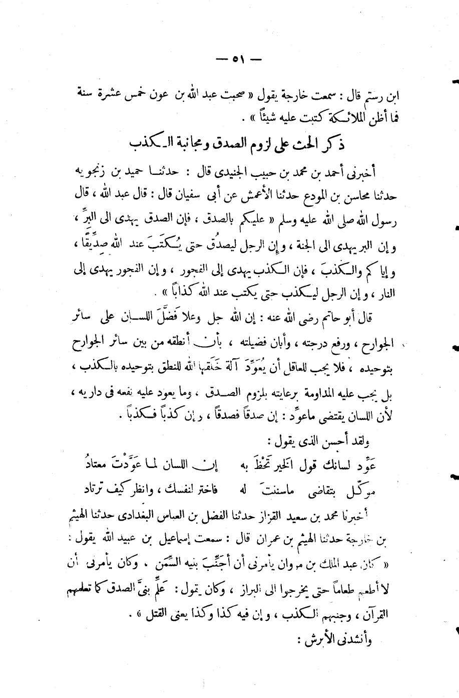 أَخْبَرَنِي أَحْمَدُ بْنُ محمد بن حبيب الجنيدي قَالَ حَدَّثَنَا حُمَيْدُ بْنُ زَنْجَوَيْهِ حَدَّثَنَا مَحَاسِنُ بْنُ الْمُوَدِّعِ حَدَّثَنَا الأَعْمَشُ عَنْ أَبِي سُفْيَانَ قَالَ قَالَ عَبْدُ اللَّهِ قَالَ رَسُولُ اللَّهِ صَلَّى اللَّهُ عَلَيْهِ وَسَلَّمَ عَلَيْكُمْ بِالصِّدْقِ فَإِنَّ الصِّدْقَ يَهْدِي إِلَى الْبِرِّ وَإِنَّ الْبِرَّ يَهْدِي إِلَى الْجَنَّةِ وَإِنَّ الرَّجُلَ لَيَصْدُقُ حَتَّى يُكْتَبَ عِنْدَ اللَّهِ صِدِّيقًا وَإِيَّاكُمْ وَالْكَذِبَ فَإِنَّ الْكَذِبَ يَهْدِي إِلَى الْفُجُورِ وَإِنَّ الْفُجُورَ يَهْدِي إِلَى النَّارِ وَإِنَّ الرَّجُلَ لَيَكْذِبُ حَتَّى يُكْتَبَ عِنْدَ اللَّهِ كَذَّابًا