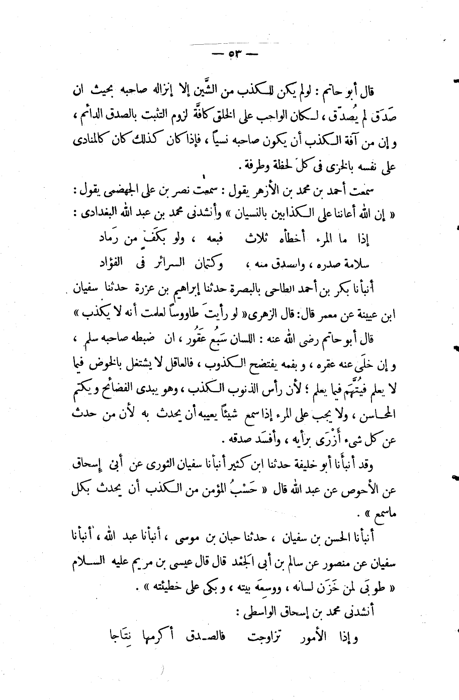 طوبى لمن خزن لسانه ووسعه بيته وبكى على خطيئته أنشدني مُحَمَّد بْن إِسْحَاق الواسطي ... وإذا الأمور تزاوجت ... فالصدق أكرمها نتاجا ...