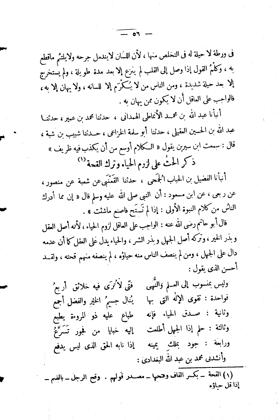 قال أَبُو حاتم رَضِيَ اللَّه عنه الواجب على العاقل لزوم الحياء لأنه أصل العقل وبذر الخير وتركه أصل الجهل وبذر الشر والحياء يدل على العقل كما أن عدمه دال على الجهل ومن لم ينصف الناس منه حياؤه لم ينصفه منهم قحته ولقد أحسن الذي يقول ... وليس بمنسوب إلى العلم والنهى ... فتى لا ترى فيه خلائق أربع