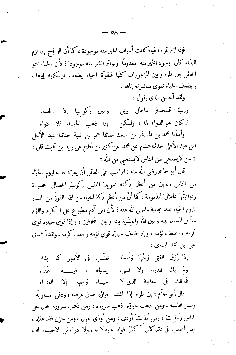 قال أَبُو حاتم رَضِيَ اللَّه عنه الواجب على العاقل أن يعود نفسه لزوم الحياء من الناس وإن من أعظم بركته تعويد النفس ركوب الخصال المحمودة ومجانبتها الخلال المذمومة كما أن من أعظم بركة الحياء من اللَّه الفوز من النار بلزوم الحياء عند مجانبة مَا نهى اللَّه عنه لأن ابن آدم مطبوع على الكرم واللؤم معا في المعاملة بينه وبين اللَّه والعشرة بينه وبين المخلوقين وإذا قوى حياؤه قوى كرمه وضعف لؤمه وإذا ضعف حياؤه قوى لؤمه وضعف كرمه ولقد أنشدني علي بْن مُحَمَّد البسامي ... إذا رزق الفتى وجها وقاحا ... تقلب في الأمور كما يشاء