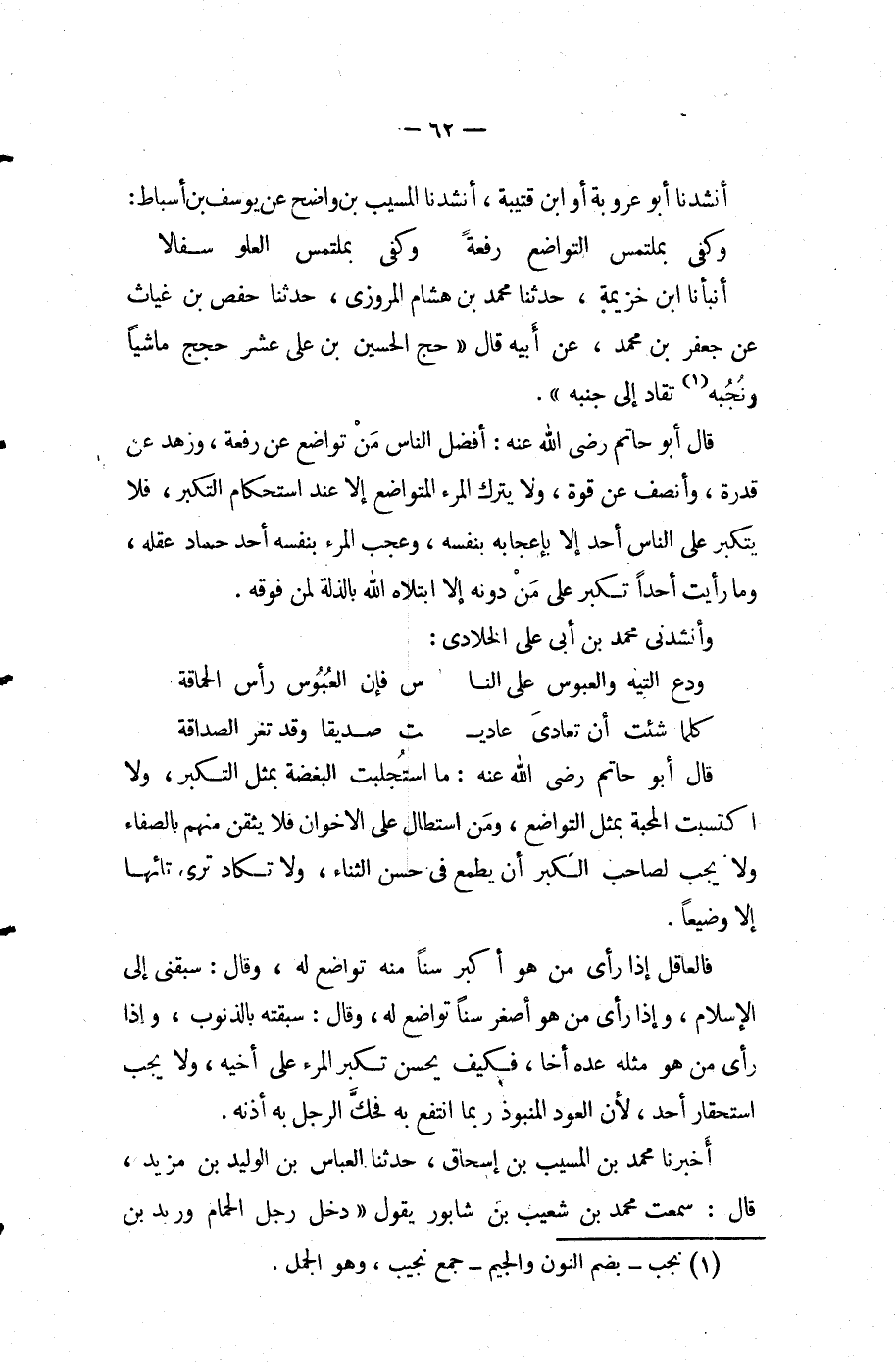 أَنْبَأَنَا ابْنُ خُزَيْمَةَ حَدَّثَنَا مُحَمَّدُ بْنُ هِشَامٍ الْمَرْوَزِيُّ حَدَّثَنَا حَفْصُ بْنُ غِيَاثٍ عَنْ جَعْفَرِ بْنِ مُحَمَّدٍ عَنْ أَبِيهِ قَالَ حَجَّ الْحُسَيْنُ بْنُ عَلِيٍّ عَشْرَ حِجَجٍ مَاشِيًا وَنُجُبُهُ تُقَادُ إِلَى جَنْبِهِ