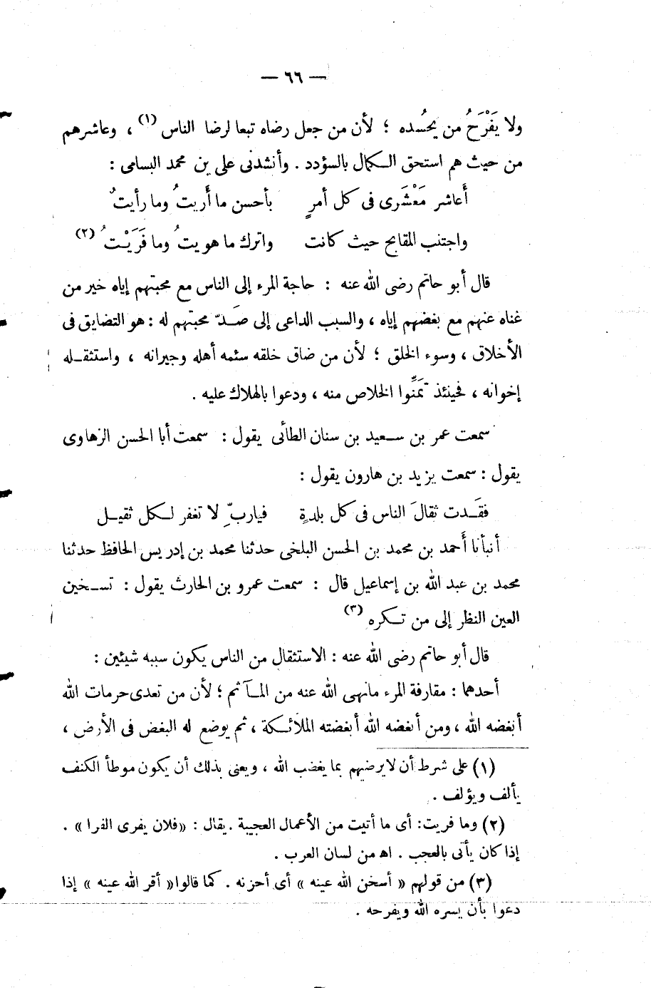 قال أَبُو حاتم رَضِيَ اللَّه عنه حاجة المرء إلى الناس مع محبتهم إياه خير من غناه عنهم مع بغضهم إياه والسبب الداعي إلى صد محبتهم له هو التضايق في الأخلاق وسوء الخلق لأن من ضاق خلقه سئمه أهله وجيرانه واستثقله إخوانه فحينئذ تمنوا الخلاص منه ودعوا بالهلاك عَلَيْهِ