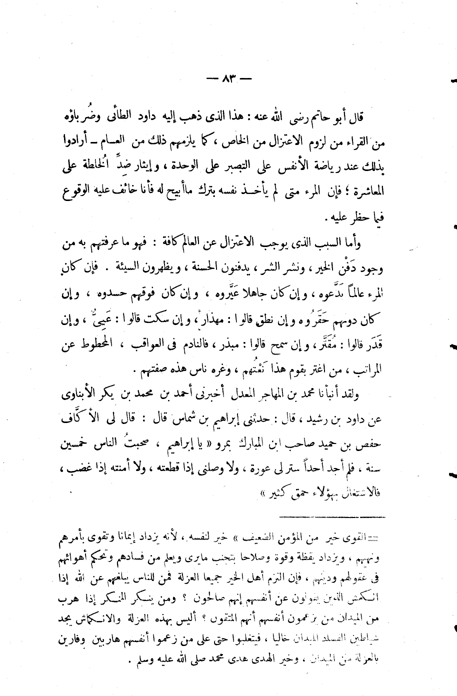 قال أَبُو حاتم رَضِيَ اللَّه عنه هذا الذي ذهب إليه داود الطائي وضرباؤه من القراء من لزوم الاعتزال من الخاص كما يلزمهم ذلك من العام أرادوا بذلك عند رياضة الأنفس على التصبر على الوحدة وإيثار ضد الخلطة على المعاشرة فإن المرء متى لم يأخذ نفسه بترك مَا أبيح له فأنا خائف عَلَيْهِ الوقوع فما حظر عَلَيْهِ