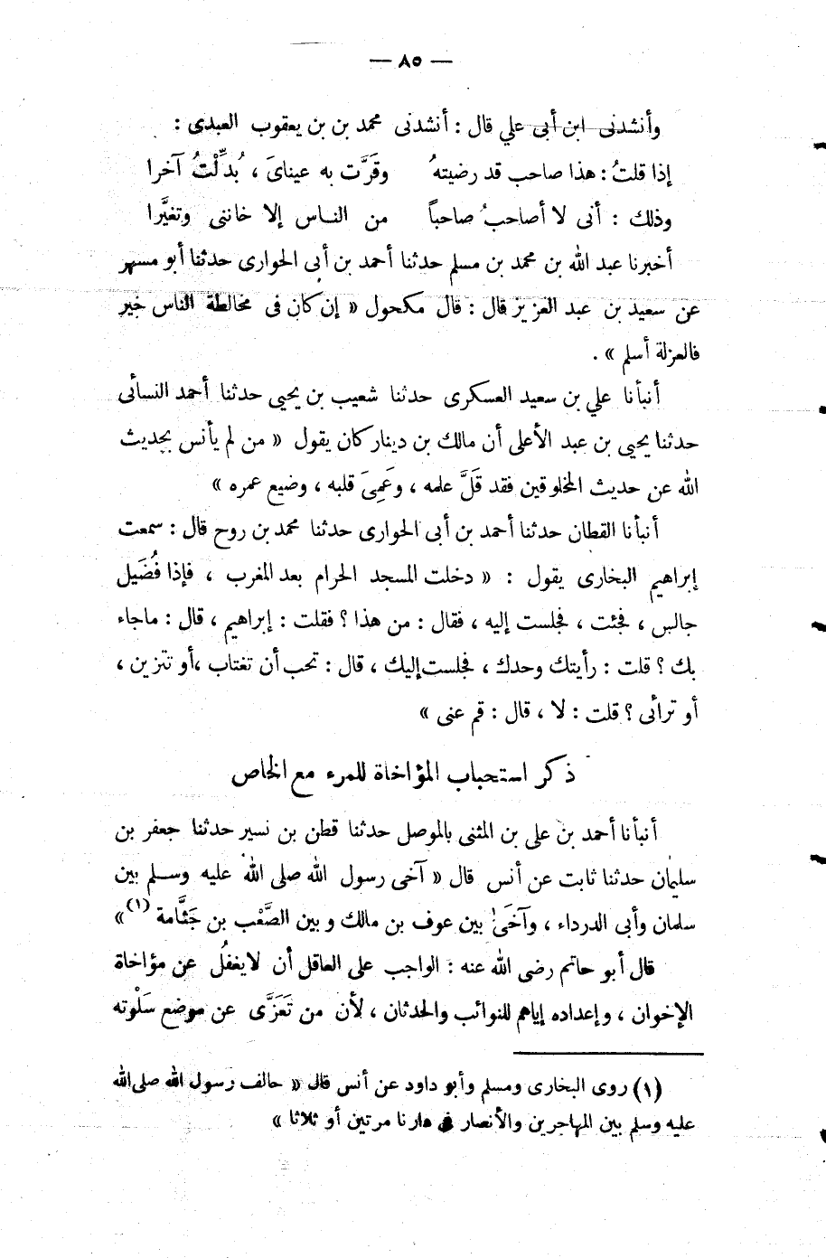 أَنْبَأَنَا أَحْمَدُ بْنُ عَلِيِّ بْنِ الْمُثَنَّى بِالْمَوْصِلِ حَدَّثَنَا قَطَنُ بْنُ نُسَيْرٍ حَدَّثَنَا جَعْفَرُ بْنُ سُلَيْمَانَ حَدَّثَنَا ثَابِتٌ عَنْ أَنَسٍ قَالَ آخَى رَسُولُ اللَّهِ صَلَّى الَّلُه عَلَيْهِ وَسَلَّمَ بَيْنَ سَلْمَانَ وَأَبِي الدَّرْدَاءِ وَآخَى بَيْنَ عَوْفِ بْنِ مَالِكٍ وَبَيْنَ الصَّعْبِ بْن جَثَّامَةَ