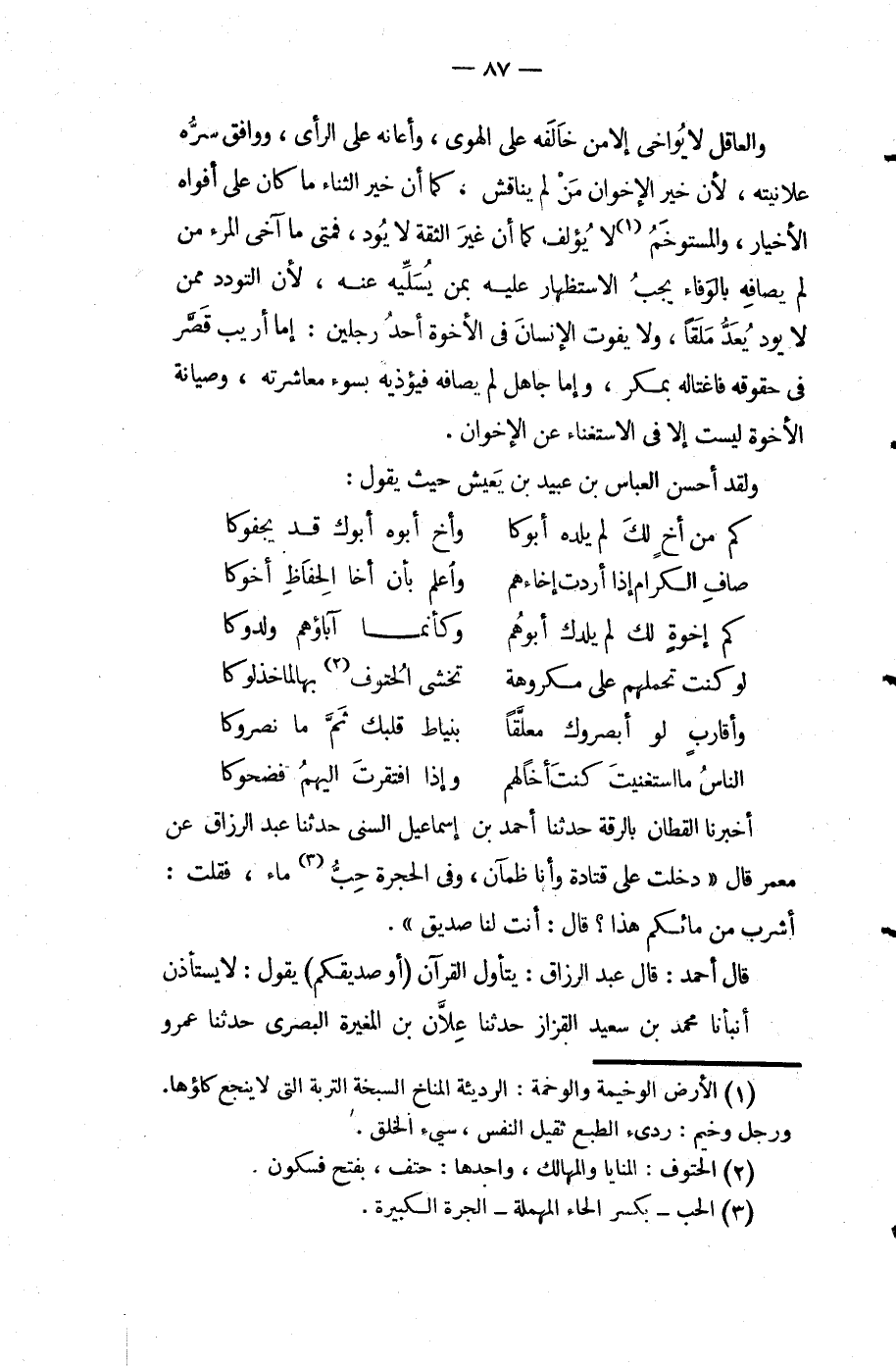 والعاقل لا يواخي إلا من خالفه على الهوى وأعانه على الرأي ووافق سره علانيته لأن خير الإخوان من لم يناقش كما أن خير الثناء مَا كان على أفواه الأخيار والمستوخم لا يؤلف كما أن غير الثقة لا يود فمتى مَا آخى المرء من لم يصافه بالوفاء يجب الاستظهار عَلَيْهِ بمن يسليه عنه لأن التودد ممن لا يود يعد ملقا ولا يفوت الإنسان في الأخوة أحد رجلين إما أريب قصر في حقوقه فاغتاله بمكر وإما جاهل لم يصافه فيؤذيه بسوء معاشرته وصيانة الأخوة ليست إلا في الاستغناء عَن الإخوان