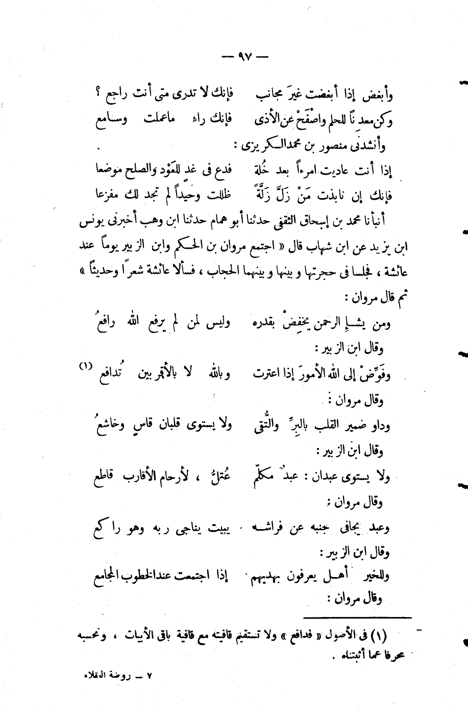 أنبأنا مُحَمَّد بْن إِسْحَاق الثقفي حَدَّثَنَا أَبُو همام حَدَّثَنَا ابن وهب أخبرني يونس ابن يزيد عَن ابن شهاب قَالَ اجتمع مروان بْن الحكم وابن الزبير يوما عند عائشة فجلسا في حجرتها وبينها وبينهما الحجاب فسألا عائشة شعرا وحديثا ثم قَالَ مروان ... ومن يشإ الرحمن يخفض بقدره ... وليس لمن لم يرفع اللَّه رافع ...