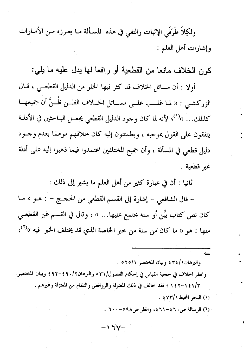 أولا: أن مسائل الخلاف قد كثر فيها الخلو من الدليل القطعي، قال الزركشي: "لما غلب على مسائل الخلاف الظن ظُنَّ أن جميعها كذلك ... "1، لأنه لما كان وجود الدليل القطعي يجعل الباحثين في الأدلة يتفقون على القول بموجبه، ويطمئنون إليه كان خلافهم موهما بعدم وجود دليل قطعي في المسألة، وأن جميع المختلفين اعتمدوا فيما ذهبوا إليه على أدلة غير قطعية.