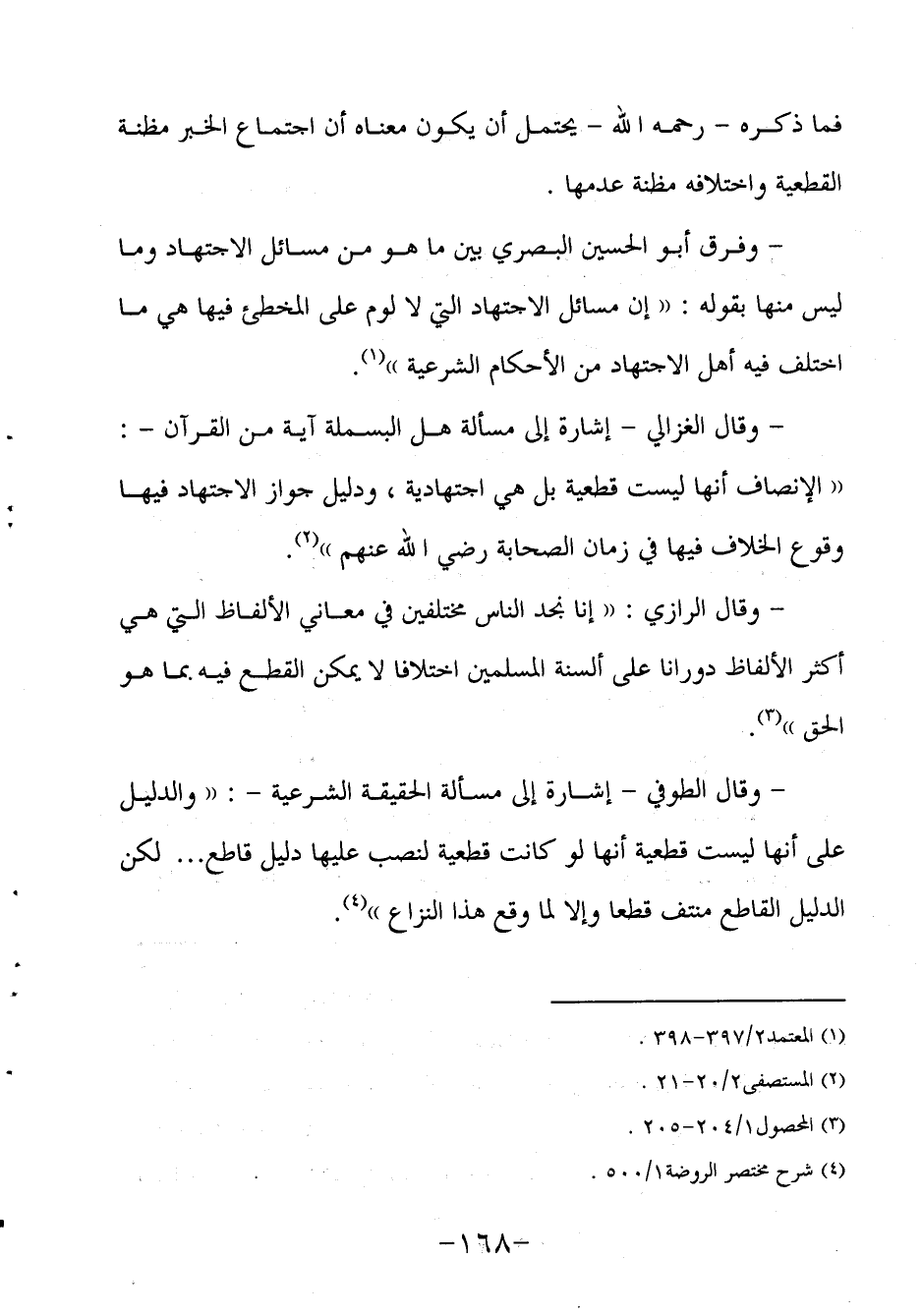 - وقال الطوفي - إشارة إلى مسألة الحقيقة الشرعية -: "والدليل على أنها ليست قطعية أنها لو كانت قطعية لنصب عليها دليل قاطع ... لكن الدليل القاطع منتف قطعا وإلا لما وقع هذا النزاع"4.
