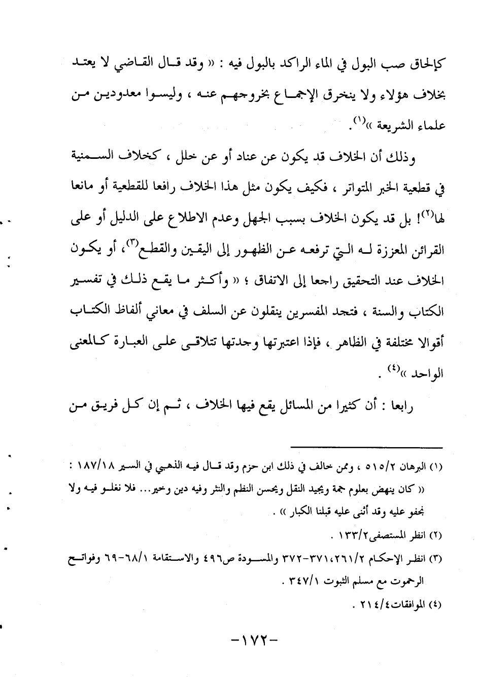 وذلك أن الخلاف قد يكون عن عناد أو عن خلل، كخلاف السمنية في قطعية الخبر المتواتر، فكيف يكون مثل هذا الخلاف رافعا للقطعية أو مانعا لها2! بل قد يكون الخلاف بسبب الجهل وعدم الاطلاع على الدليل أو على القرائن المعززة له التي ترفعه عن الظهور إلى اليقين والقطع3، أو يكون الخلاف عند التحقيق راجعا إلى الاتفاق، "وأكثر ما يقع ذلك في تفسير الكتاب والسنة، فتجد المفسرين ينقلون عن السلف في معاني ألفاظ الكتاب أقوالا مختلفة في الظاهر، فإذا اعتبرتها وجدتها تتلاقى على العبارة كالمعنى الواحد"4.