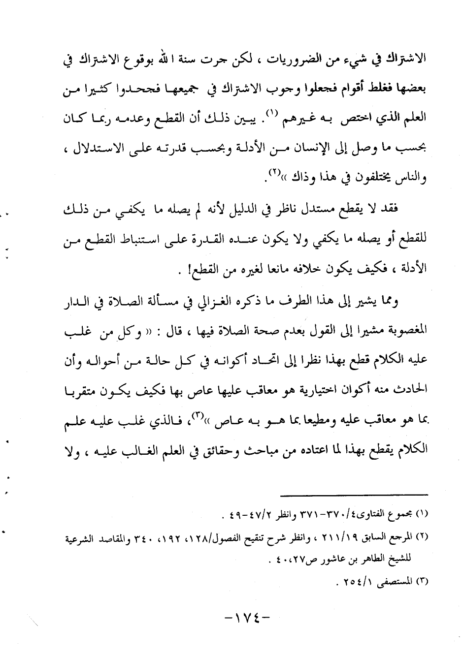 عدم الاشتراك في شيء من الضروريات، لكن جرت سنة الله بوقوع الاشتراك في بعضها فغلط أقوام فجعلوا وجوب الاشتراك في جميعها فجحدوا كثيرا من العلم الذي اختص به غيرهم 1. يبين ذلك أن القطع وعدمه ربما كان بحسب ما وصل إلى الإنسان من الأدلة وبحسب قدرته على الاستدلال، والناس يختلفون في هذا وذاك"2.