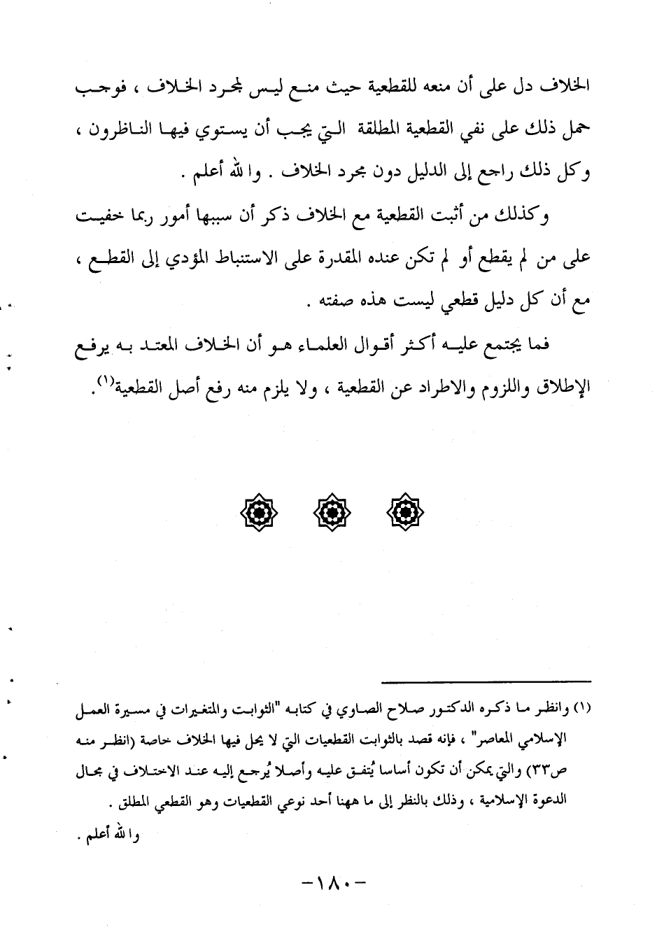 1 وانظر ما ذكره الدكتور صلاح الصاوي في كتابه "الثوابت والمتغيرات في مسيرة العمل الإسلامي المعاصر"، فإنه قصد بالثوابت القطعيات التي لا يحل فيها الخلاف خاصة (انظر منه ص33) والتي يمكن أن تكون أساسا يُتفق عليه وأصلا يُرجع إليه عند الاختلاف في مجال الدعوة الإسلامية، وذلك بالنظر إلى ما ههنا أحد نوعي القطعيات وهو القطعي المطلق. والله أعلم.