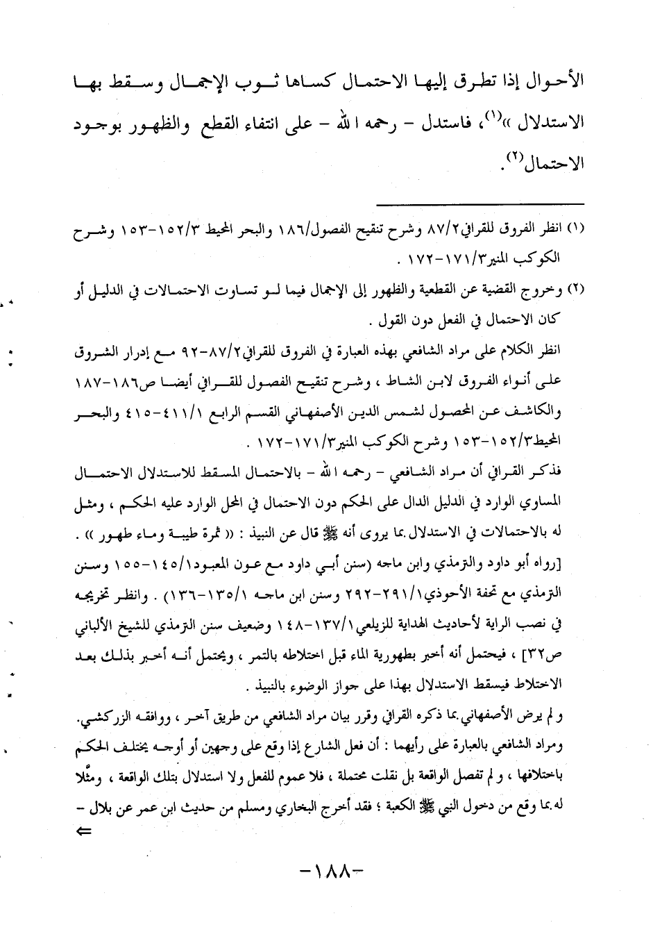 فذكر القرافي أن مراد الشافعي - رحمه الله - بالاحتمال المسقط للاستدلال الاحتمال المساوي الوارد في الدليل الدال على الحكم دون الاحتمال في المحل الوارد عليه الحكم، ومثل له بالاحتمالات في الاستدلال بما يروى أنه صلى الله عليه وسلم قال عن النبيذ: "ثمرة طيبة وماء طهور". [رواه أبو داود والترمذي وابن ماجه (سنن أبي داود مع عون المعبود1/145-155 وسنن الترمذي مع تحفة الأحوذي1/291-292 وسنن ابن ماجه 1/135-136) . وانظر تخريجه في نصب الراية لأحاديث الهداية للزيلعي1/137-148 وضعيف سنن الترمذي للشيخ الألباني ص32] ، فيحتمل أنه أخبر بطهورية الماء قبل اختلاطه بالتمر ويحتمل أنه أخبر بذلك بعد الاختلاط فيسقط الاستدلال بهذا على جواز الوضوء بالنبيذ.