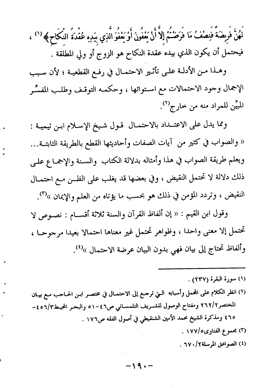 ومما يدل على الاعتداد بالاحتمال قول شيخ الإسلام ابن تيمية: "والصواب في كثير من آيات الصفات وأحاديثها القطع بالطريقة الثابتة ... ويعلم طريقة الصواب في هذا وأمثاله بدلالة الكتاب والسنة والإجماع على ذلك دلالة لا تحتمل النقيض، وفي بعضها قد يغلب على الظن مع احتمال النقيض، وتردد المؤمن في ذلك هو بحسب ما يؤتاه من العلم والإيمان"3.