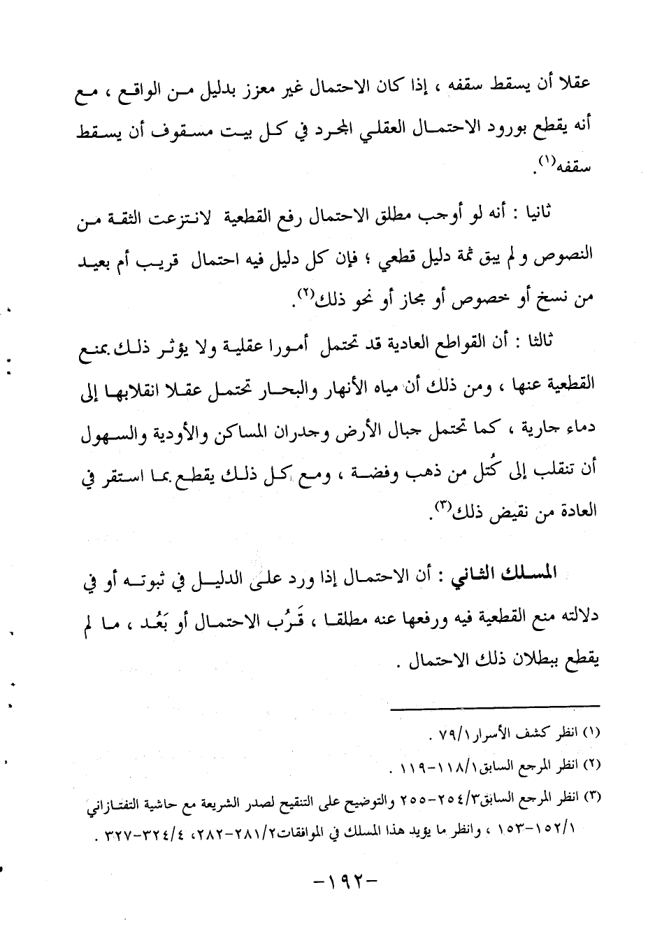 ثانيا: أنه لو أوجب مطلق الاحتمال رفع القطعية لانتزعت الثقة من النصوص ولم يبق ثمة دليل قطعي، فإن كل دليل فيه احتمال قريب أم بعيد من نسخ أو خصوص أو مجاز أو نحو ذلك2.