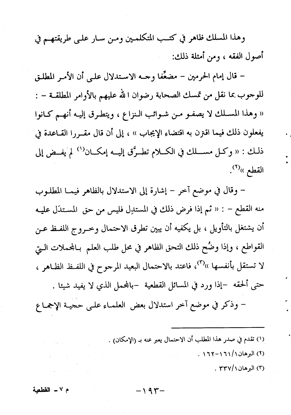 - قال إمام الحرمين - مضعِّفا وجه الاستدلال على أن الأمر المطلق للوجوب بما نقل من تمسك الصحابة رضوان الله عليهم بالأوامر المطلقة -: "وهذا المسلك لا يصفو من شوائب النزاع، ويتطرق إليه أنهم كانوا يفعلون ذلك فيما اقترن به اقتضاء الإيجاب"، إلى أن قال مقررا القاعدة في ذلك: "وكل مسلك في الكلام تطرَّق إليه إمكان1 لم يفض إلى القطع"2.