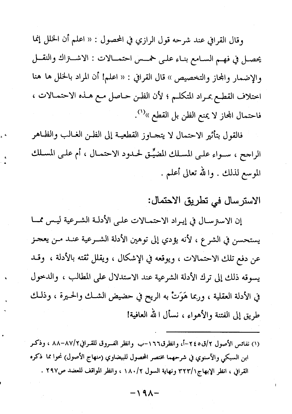 إن الاسترسال في إيراد الاحتمالات على الأدلة الشرعية ليس مما يستحسن في الشرع، لأنه يؤدي إلى توهين الأدلة الشرعية عند من يعجز عن دفع تلك الاحتمالات، ويوقعه في الإشكال، ويقلل ثقته بالأدلة، وقد يسوقه ذلك إلى ترك الأدلة الشرعية عند الاستدلال على المطالب، والدخول في الأدلة العقلية، وربما هَوَتْ به الريح في حضيض الشك والحيرة، وذلك طريق إلى الفتنة والأهواء، نسأل الله العافية!