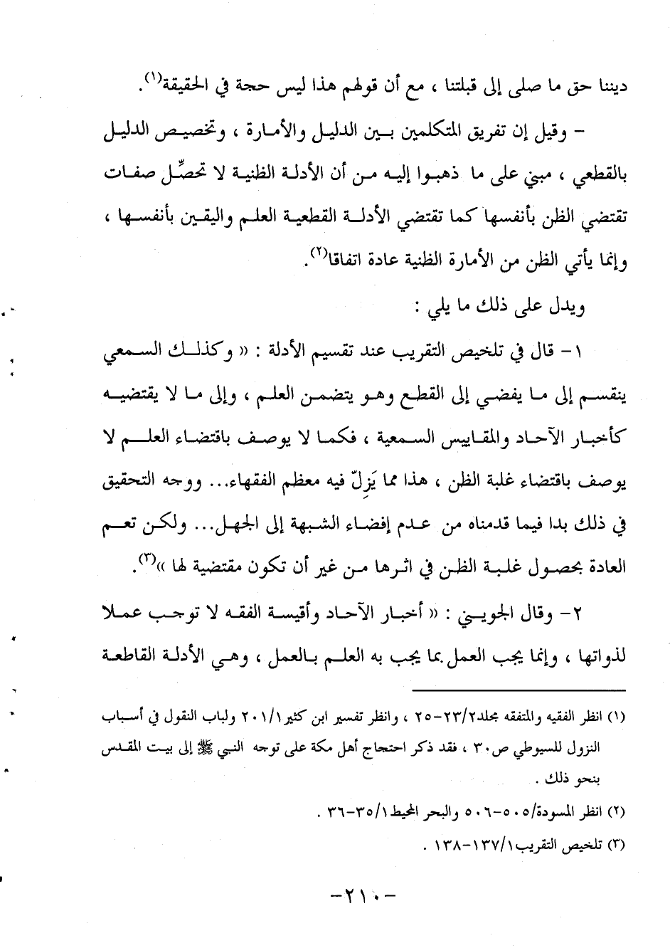 1- قال في تلخيص التقريب عند تقسيم الأدلة: "وكذلك السمعي ينقسم إلى ما يفضي إلى القطع وهو يتضمن العلم، وإلى ما لا يقتضيه كأخبار الآحاد والمقاييس السمعية، فكما لا يوصف باقتضاء العلم لا يوصف باقتضاء غلبة الظن، هذا مما يَزِلّ فيه معظم الفقهاء ... ووجه التحقيق في ذلك بدا فيما قدمناه من عدم إفضاء الشبهة إلى الجهل ... ولكن تعم العادة بحصول غلبة الظن في أثرها من غير أن تكون مقتضية لها"3.