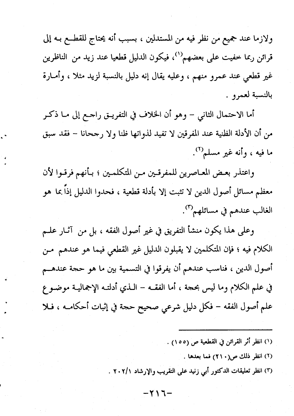 واعتذر بعض المعاصرين للمفرقين من المتكلمين، بأنهم فرقوا لأن معظم مسائل أصول الدين لا تثبت إلا بأدلة قطعية، فحدوا الدليل إذاً بما هو الغالب عندهم في مسائلهم3.