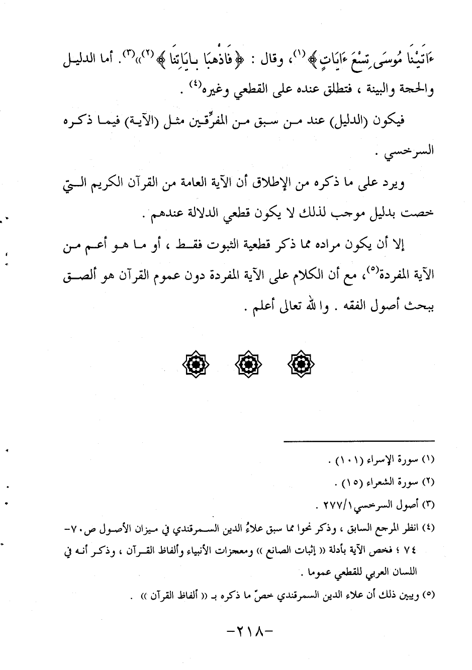 إلا أن يكون مراده مما ذكر قطعية الثبوت فقط، أو ما هو أعم من الآية المفردة5، مع أن الكلام على الآية المفردة دون عموم القرآن هو ألصق ببحث أصول الفقه. والله تعالى أعلم.