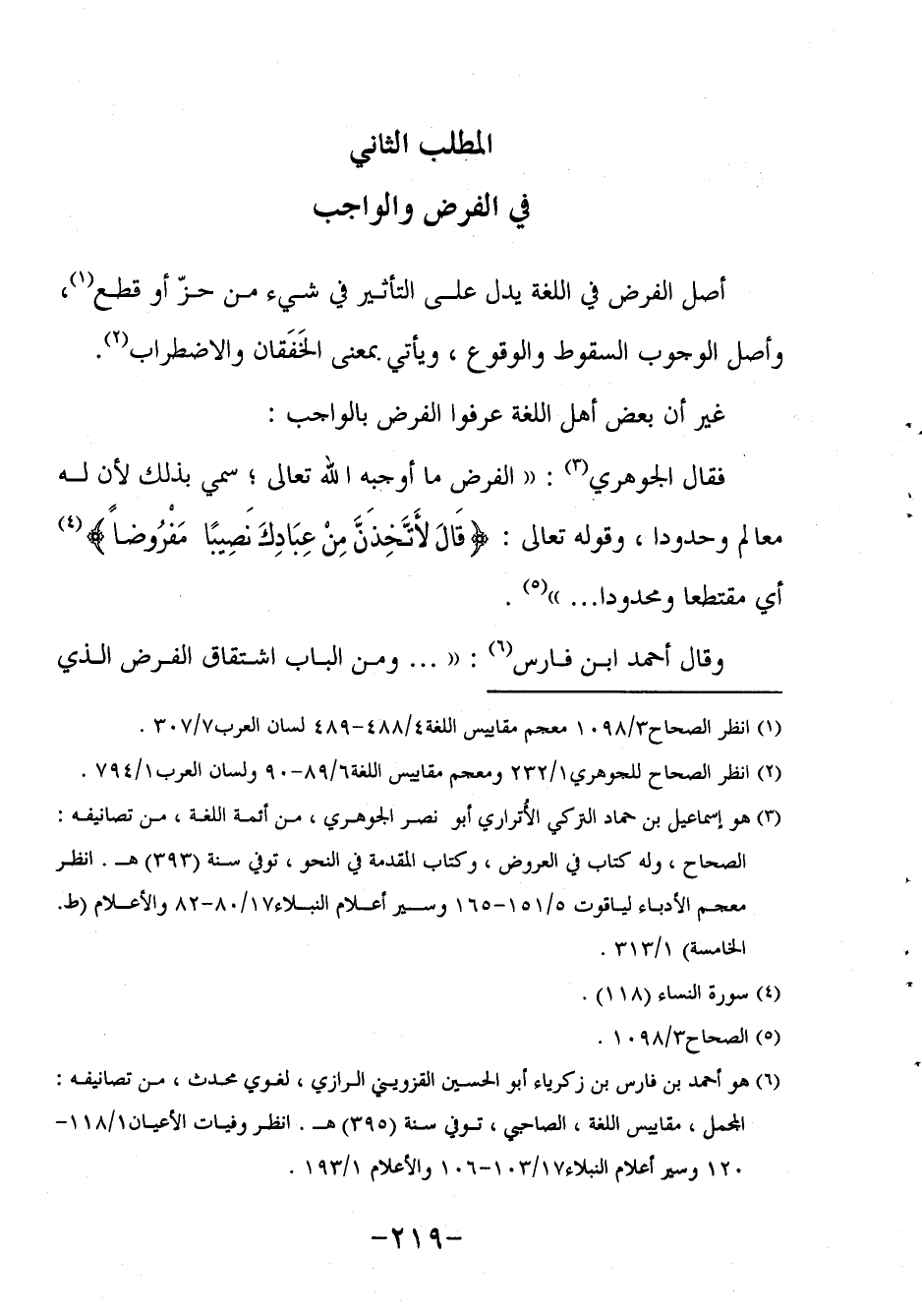 فقال الجوهري3: "الفرض ما أوجبه الله تعالى، سمي بذلك لأن له معالم وحدودا، وقوله تعالى: {قَالَ لأَتَّخِذَنَّ مِنْ عِبَادِكَ نَصِيبًا مَفْرُوضاً} 4 أي مقتطعا ومحدودا ... "5.