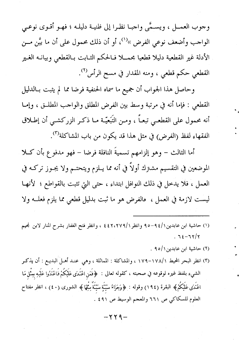 وحاصل هذا الجواب أن جميع ما سماه الحنفية فرضا مما لم يثبت بالدليل القطعي: فإما أنه في مرتبة وسط بين الفرض المطلق والواجب المطلق، وإما أنه محمول على القطعي تبعاً، وذكر الزركشي أن إطلاق الفقهاء لفظ (الفرض) في مثل هذا قد يكون من باب المشاكلة3.