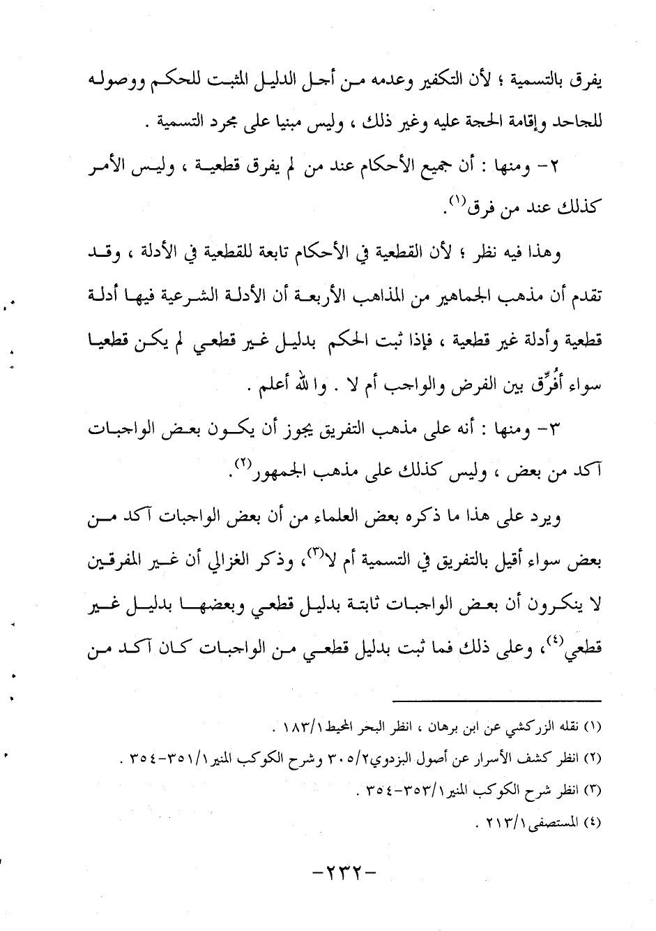 وهذا فيه نظر لأن القطعية في الأحكام تابعة للقطعية في الأدلة، وقد تقدم أن مذهب الجماهير من المذاهب الأربعة أن الأدلة الشرعية فيها أدلة قطعية وأدلة غير قطعية، فإذا ثبت الحكم بدليل غير قطعي لم يكن قطعيا سواء أفُرِّق بين الفرض والواجب أم لا. والله أعلم.