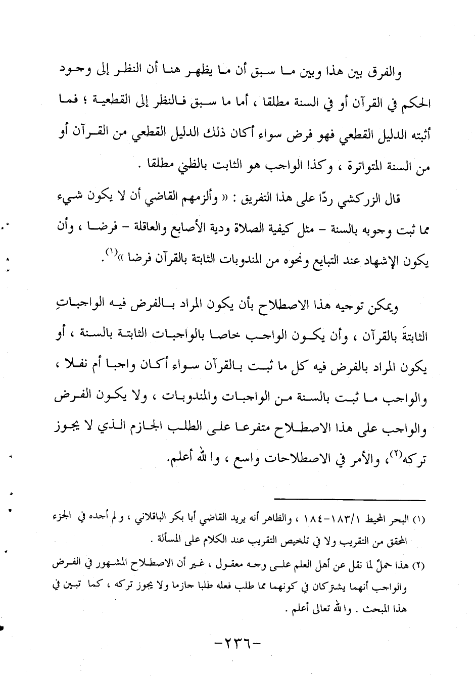 2 هذا حملٌ لما نقل عن أهل العلم على وجه معقول، غير أن الاصطلاح المشهور في الفرض والواجب أنهما يشتركان في كونهما مما طلب فعله طلبا جازما ولا يجوز تركه كما تبين في هذا المبحث. والله تعالى أعلم.