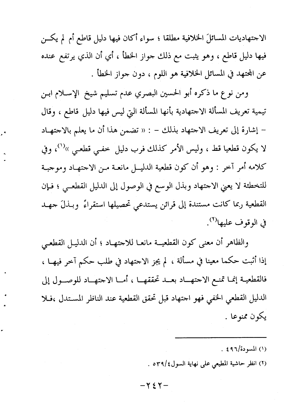 ومن نوع ما ذكره أبو الحسين البصري عدم تسليم شيخ الإسلام ابن تيمية تعريف المسألة الاجتهادية بأنها المسألة التي ليس فيها دليل قاطع، وقال إشارة إلى تعريف الاجتهاد بذلك: "تضمن هذا أن ما يعلم بالاجتهاد لا يكون قطعيا قط، وليس الأمر كذلك فرب دليل خفي قطعي"1، وفي كلامه أمر آخر: وهو أن كون قطعية الدليل مانعة من الاجتهاد وموجبة للتخطئة لا يعني الاجتهاد وبذل الوسع في الوصول إلى الدليل القطعي، فإن القطعية ربما كانت مستندة إلى قرائن يستدعي تحصيلها استقراءً وبذلَ جهد في الوقوف عليها2.
