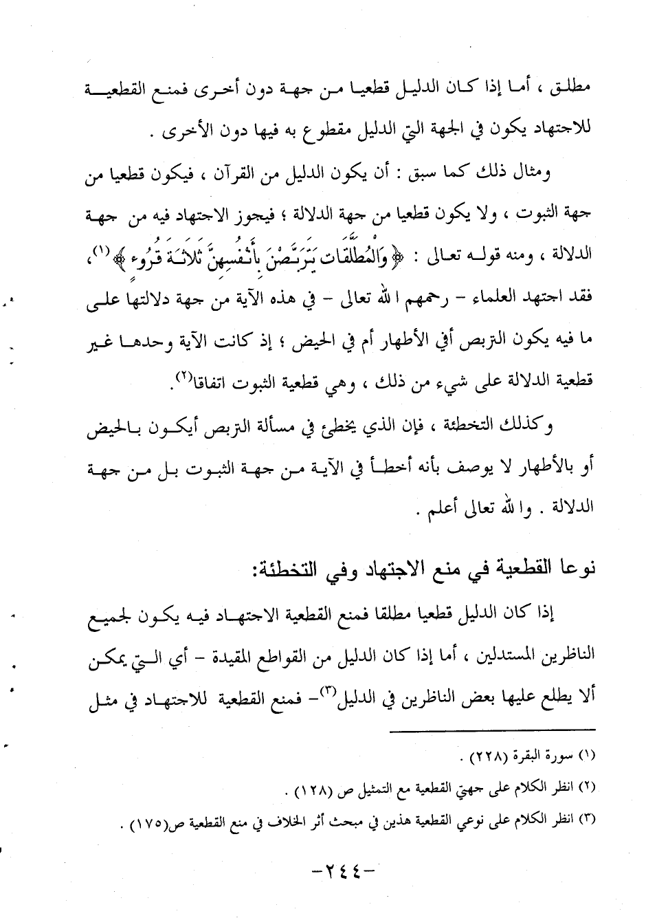 3 انظر الكلام على نوعي القطعية هذين في مبحث أثر الخلاف في منع القطعية ص (175) .