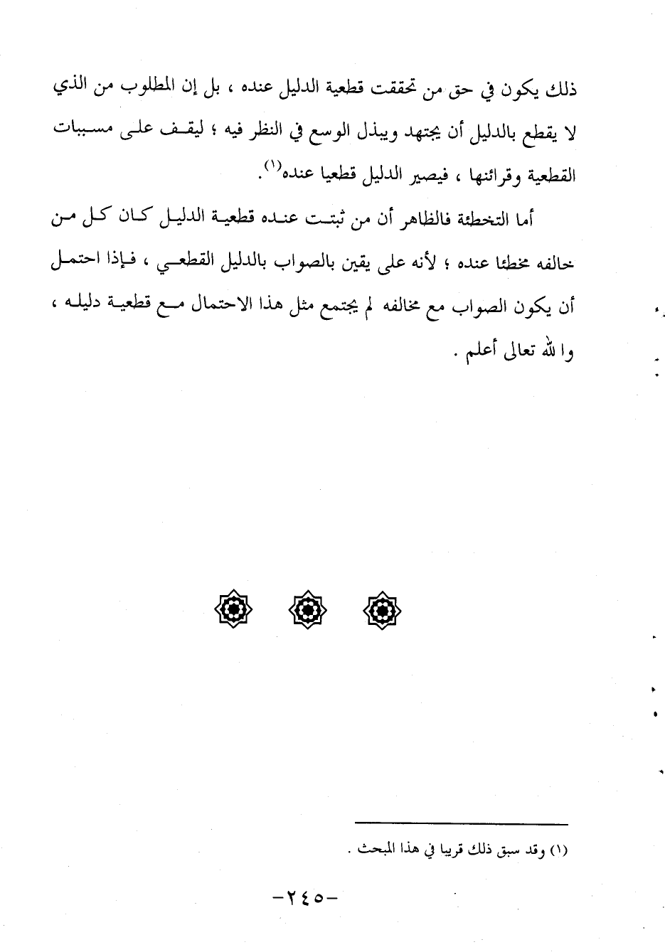 أما التخطئة فالظاهر أن من ثبتت عنده قطعية الدليل كان كل من خالفه مخطئا عنده، لأنه على يقين بالصواب بالدليل القطعي، فإذا احتمل أن يكون الصواب مع مخالفه لم يجتمع مثل هذا الاحتمال مع قطعية دليله، والله تعالى أعلم.