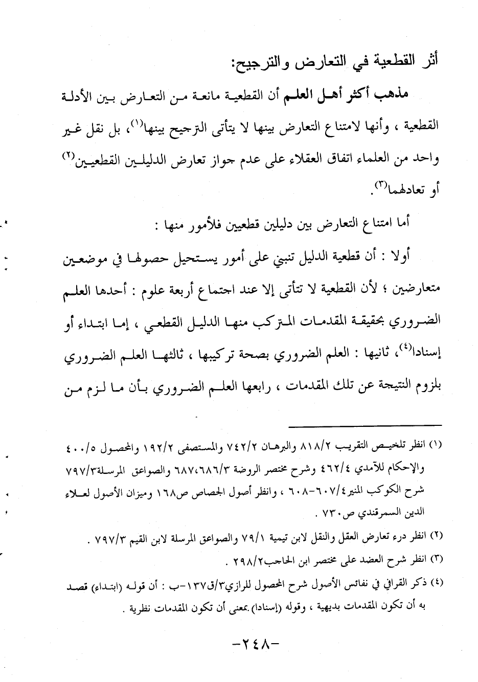 أولا: أن قطعية الدليل تنبني على أمور يستحيل حصولها في موضعين متعارضين، لأن القطعية لا تتأتى إلا عند اجتماع أربعة علوم: أحدها العلم الضروري بحقيقة المقدمات المتركب منها الدليل القطعي، إما ابتداء أو إسنادا4، ثانيها: العلم الضروري بصحة تركيبها، ثالثها العلم الضروري بلزوم النتيجة عن تلك المقدمات، رابعها العلم الضروري بأن ما لزم من