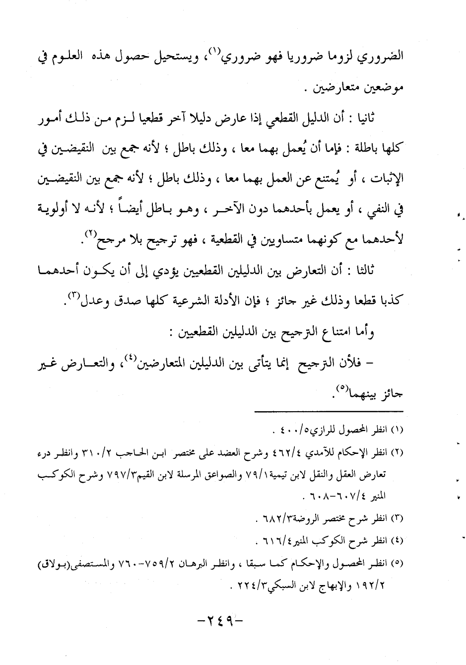 ثانيا: أن الدليل القطعي إذا عارض دليلا آخر قطعيا لزم من ذلك أمور كلها باطلة: فإما أن يُعمل بهما معا وذلك باطل لأنه جمع بين النقيضين في الإثبات، أو يُمتنع عن العمل بهما معا وذلك باطل لأنه جمع بين النقيضين في النفي، أو يعمل بأحدهما دون الآخر وهو باطل أيضاً لأنه لا أولوية لأحدهما مع كونهما متساويين في القطعية، فهو ترجيح بلا مرجح2.